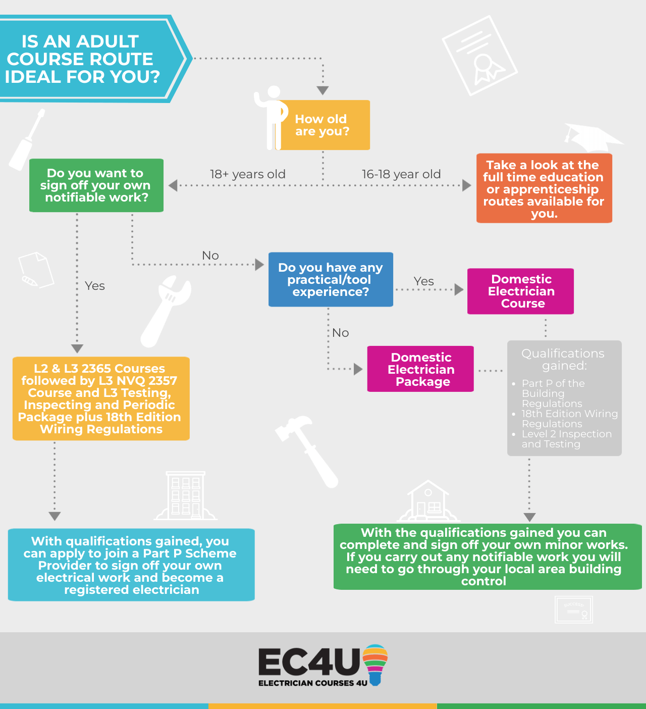 Although the structure of the adult learner route may vary across training facilities, they all lead to a Level 3 NVQ in Electrical Installation or Maintenance. This qualification is required for joining a Competent Persons Scheme or applying for an ECS Gold Card.